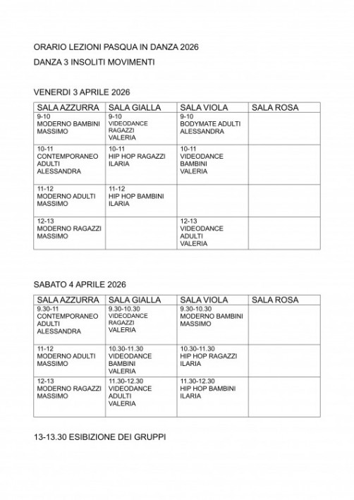 Il 3/4 aprile 2026, presso la sede di Danza 3 Insoliti Movimenti, ci sarà la possibilità di accedere alle lezioni del pacchetto offerto, e avere l'oppurtunità di conoscere le attività dell'Associazione, provare nuove lezioni e discipline, vivere un'esperienza unica nel suo genere.